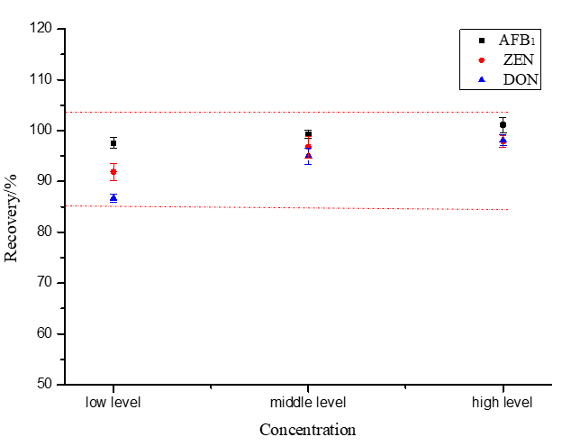 AFB1、ZEN、DON在高中低3个浓度下回收率
