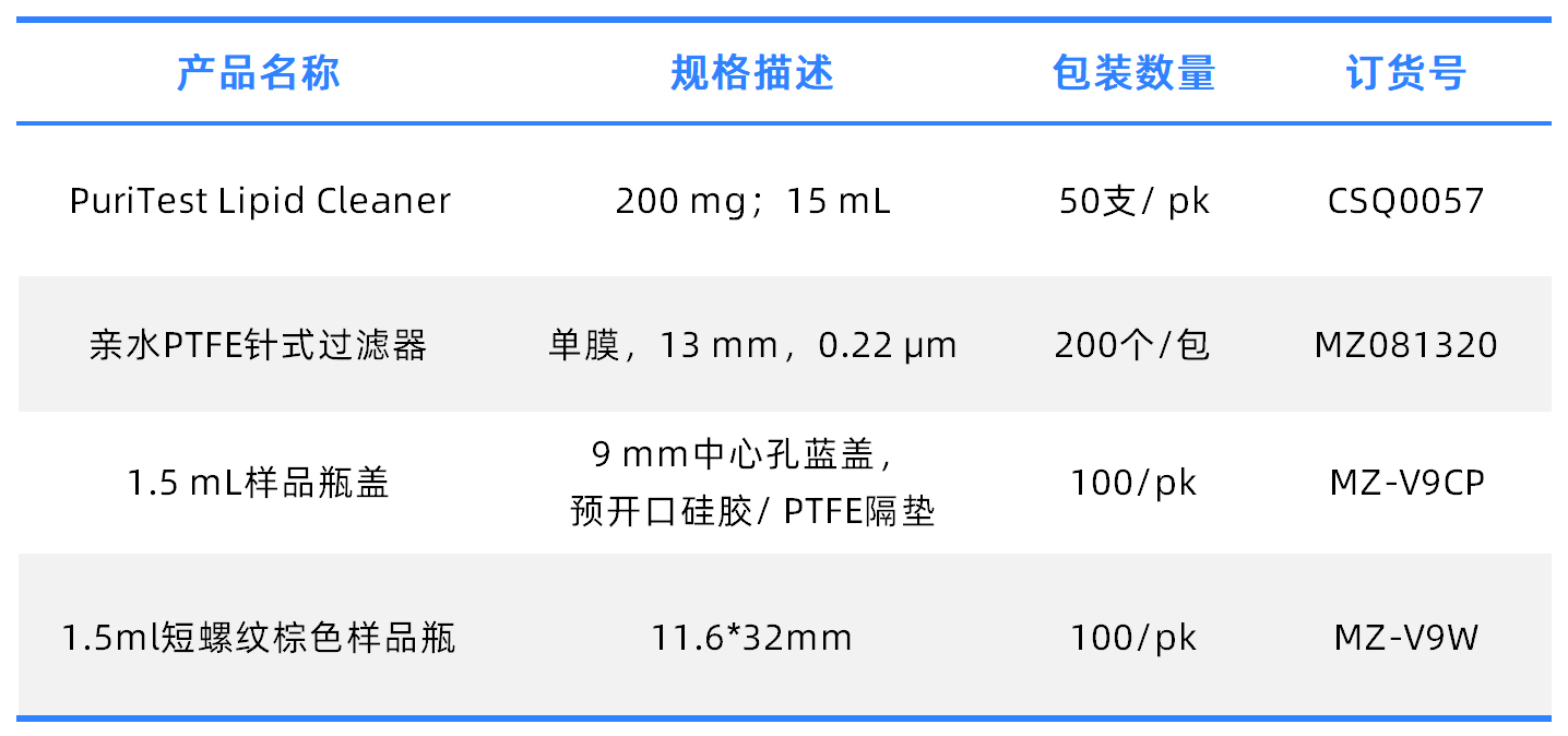 吸取3 mL上清液加入到PuriTest Lipid Cleaner净化管(订货号:CSQ0057)中,振摇1 min,静置1 min,之后净化液过0.22 µm PTFE亲水滤膜,取过滤液0.5 mL加超纯水0.5 mL混匀,供LC-MS/MS测定。